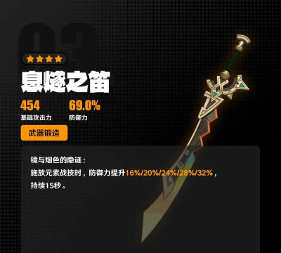 单手剑“岩峰巡歌”,新角色希诺宁的专武,拥有防御副词条,通过堆3200的防御来解锁25.6%的全队元素伤害加成。如果是将希诺宁作为主C,那么则可以给自身提供45%的增伤。单看防御面板,阿贝多、千织可用,辅助队友打核爆可以给水神用来堆防御。