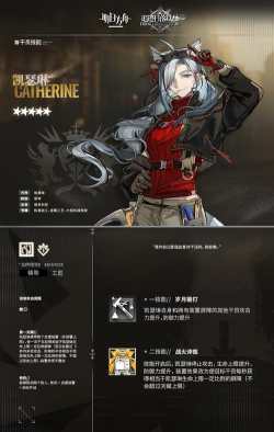 她本身的特性是可以阻挡两个敌人,并且可以使用支援装置协助作战。凯瑟琳的一技能是岁月锻打,这个技能是让凯瑟琳自身以及拥有屏障的干员的攻击以及防御力得到提升。