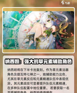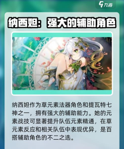 第二个角色是纳西妲,作为草元素的五星角色,使用法器作为武器,她在队伍当中可以作为草系的副C使用,作为元素精通的辅助也可行,不仅能够提供持续的草元素反应,而且可以使用元素精通提升队伍整体的输出伤害能力。