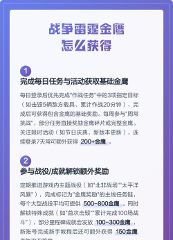 在游戏内,其实会推出许多的日常以及周常等任务,玩家在完成以后,系统也会根据难度来为玩家发放一定的金鹰作为奖励,比如在完成一定次数的战斗任务、达到特定击杀目标,或者是在战斗中获得较高评分等,都可获得金鹰奖励。