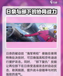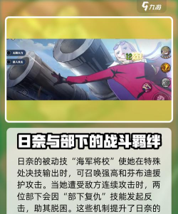 第二个被动“海军将校”,当她出战时,强高和芬布迪会作为观众观战,当她完成一次特殊处决后,观众会进入崇拜状态,可以通过“部下助阵”依次呼唤强高和芬布迪进行援护;当日奈被持续攻击一段时间,强高和芬布迪会进入愤怒状态,可以通过“部下复仇”召唤他俩攻击敌人,让自己摆脱困境。