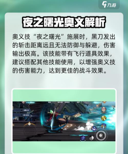 奥义技“夜之曙光”施展后,他会使用黑刀发出一记强有力的斩击,本次斩击的距离非常的远,而且这个斩击是无法被防御躲避的,拥有非常强的输出效果,这是具有飞行道具效果的,所以最好和其他技能一起组合使用,进一步提高该奥义的伤害。