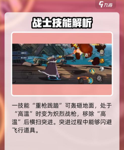 一技能“重枪践踏”,释放后他会怒挥动大战枪轰砸地面,在“高温”状态下,该技能变更为炽烈战枪,使用后会移除“高温”,从而挥舞战枪向前横扫突进,在冲锋过程中可以闪避飞行道具。