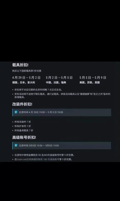 周年庆也是每年都会打折的时间,虽然具体的周年庆日期尚未公布,但根据往年的惯例,它通常会在11月上旬进行。周年庆期间,游戏会推出一系列庆祝活动,包括打折、送礼包等,是大家入手心仪载具的好时机。冬季促销则通常会在12月下旬至新年期间进行,这也是一年中打折力度较大的时期之一。