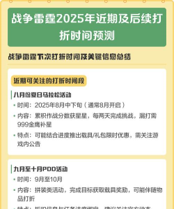 战争雷霆是一款深受大家喜爱的军事战争游戏,丰富的载具种类和逼真的战斗体验一直备受赞誉。每年游戏中的打折活动,更是让玩家们能够以更优惠的价格入手心仪的载具。战争雷霆打折时间表2025年的已经出炉了吗,是不是大家都很期待呢,小编将为大家详细解析2025年战争雷霆可能会出现的打折时间。