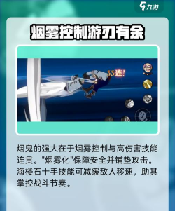二技能“白色疾风”,该技能使用后会让他全身变成烟雾状态,之后通过喷射烟雾产生爆发性的反作用力来向前冲击对手,最后从烟雾中出现,用十手攻击对方目标,烟雾化的过程烟鬼是无敌的。
