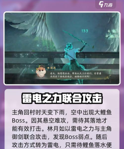 之后主角回到村庄,发现天空出现变化下起大雨,从空中出现了一只大鲤鱼,这个鲤鱼处于空中,玩家们想要对其造成重创是比较困难的,只能等鲤鱼落入地面的时候进行攻击,但消耗终归是有限的,因此林月如师姐便用雷电的力量跟主角的御剑直接联合攻击,从而发现了boss的弱点。