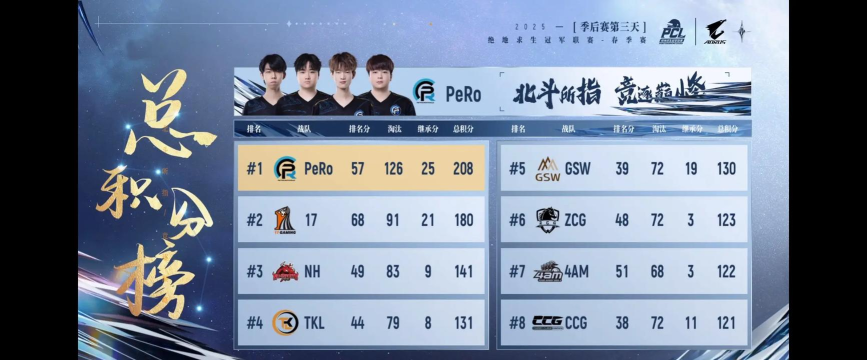 PeRo战队在决赛日凭借团队协作、战术执行与个人实力的完美结合,以总分208分的绝对优势夺冠。尤其在关键局(Match 13)中,他们通过精准劝架、绕后突袭和决赛圈火力压制,以教科书级别的操作拿下首鸡,奠定积分领先基础。