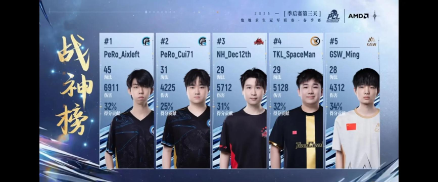 同时小叮当还获得了战神榜个人荣誉TOP 1:Aixleft(PeRo),以场均伤害、淘汰数、生存时间三项数据断层领先,决赛日多次上演“一穿多”名场面(如Match 18单局14淘汰)。其他上榜选手还有MMing(PeRo)、Xbei(17)、Ming(GSW)、十二月(NH)。