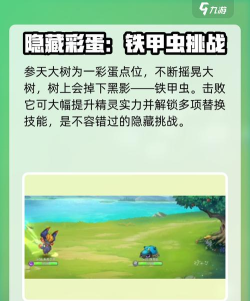 这个参天大树也是一个彩蛋点位,触发的条件是不断摇晃大树,摇晃后会发现树上面掉下来的一个黑影,这个黑影便是铁甲虫,将其击败后不仅能大幅度提升精灵的实力还能解锁很多替换技能,是不容错过的打怪彩蛋。