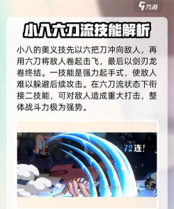 他的奥义技会将六把刀架在一起冲向敌人,随后还会用六把刀将敌人高高卷起并击飞,最后再发动强力的剑刃龙卷将敌人终结,小八整体非常强势,他的一技能是一个特别厉害的起手招式,让敌人无法躲避接下来的攻击,只要玩家能在六刀流状态接上二技能就会对敌人造成一次沉重的打击。