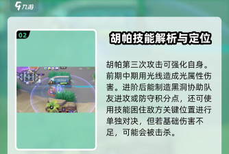 那么来看胡帕,大家想要去玩它的话,一是需要了解它的定位,搞清楚它打什么位置,二是需要了解它的技能。而说到技能和定位,首先要带大家看是定位,这只宝可梦的定位为辅助型的特攻宝可梦,也就是说这只宝可梦在游戏中需要辅助队友,前期需要绑定一位队友辅助它去吃线发育,后期需要绑定多位队友去打团,需要负责补伤害给到队友保护,这就是该宝可梦的定位了,了解定位后下面就轮到技能了。