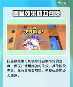 如果是四星级,这就意味着马上就会形成一个特殊的效果,而且还可以直接加快母鸡去召唤小鸡的速度,但这一个效果在使用时往往都会有限制性,只有玩家在使用疾驰的过程中才会生效,如果是其他的阶段,根本就没有作用。总之从头到尾来看,这都是让人觉得非常满意。