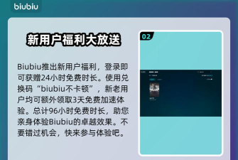 这个依靠biubiu是可以很好的解决的,快速的重新下载吧。我们现在用福利超级多的,注册账号去吧,新人的礼包里面有24小时免费试用时间哦,还有福利码用,【biubiu不卡顿】是开放给新老用户的,换来的是72小时额外服务时间,这下新手能够领取到96小时服务时间用了。