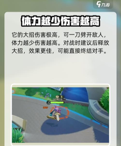 它的大招,伤害非常高,可以一刀将敌人劈开,而且此时我们的体力越少,能打出的伤害就越高,所以大家在对战的时候,尽量将大招的释放放在后面,不仅效果会更好还有可能直接终结对手。