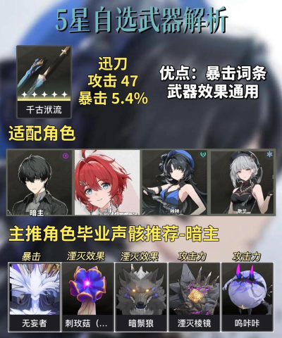 这是一把迅刀,主词条能够提升角色攻击。副词条则可提升暴击率,能大幅增强角色的爆发伤害。另外还能提升共鸣效率,若是技能击中对方后。便可提升你的攻击力,如果你说抽到的角色缺乏暴击率的话,最好选择它。例如散华、漂泊者、丹瑾,这些攻击力强但却没有暴击加成的角色。