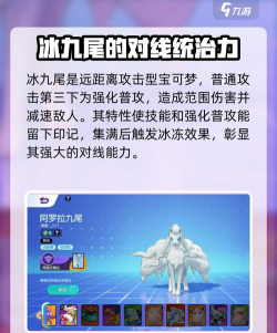 冰九尾是远距离攻击型宝可梦,它的普通攻击会在第三下变为强化普攻,强化普攻能造成范围伤害,降低敌人的移动速度,它的特性会让技能和强化普攻给敌人留下印记,这个印记打满后可以对其造成冰冻效果,这也是它对线能力强的主要原因。