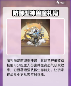 魔礼海是守护四方天门的神将之一,它是一个超强的绝品防御神兽,它拥有能够给己方队友分摊伤害的能力,可以在开局时就释放一次护佑的能力,保证角色的安全,同时可以帮助队友分担伤害,提高队友的怒气值,安全感十足的神兽。