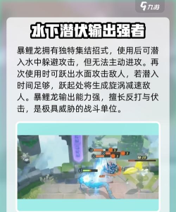 它还有一个集结招式,使用后会进入水中,从而使得自己无法被敌人锁定,但该状态自身也无法进行攻击,再次使用这个招式的时候会猛地跃起对敌人进行攻击,如果潜入的时候达到一定时长,还会再跃起的地点生成旋涡,进入旋涡的敌人将会持续赋予减速效果,整体来看暴鲤龙输出突出,反打能力和草丛蹲人能力都很强。