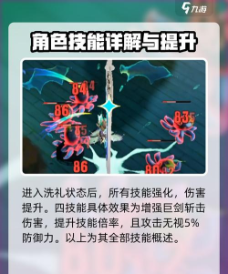 在进入到洗礼状态之后所有技能都回被强化,伤害回得到一定程度的提升。最后是她的四技能,这具体的效果为强化巨剑的斩击伤害,提高技能倍率,此外还会给到巨剑一个攻击无视5%防御力的效果,这就是她所有的技能了。