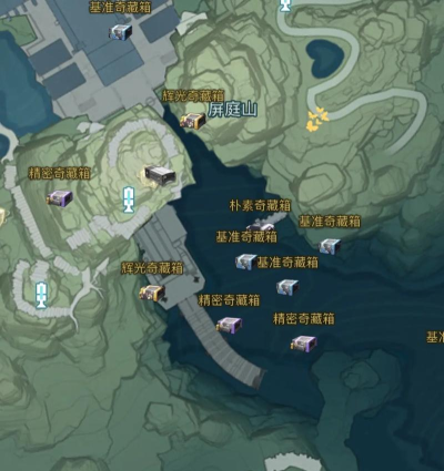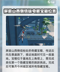 最后一个奇藏宝箱位于屏庭山西侧区域的信标,传送以后直接向左手边的悬崖跳下去,快到地的时候能看到一座基地,在基地左上方角落的塔上就有一个挑战等待大家完成,和第一个隐藏宝箱差不多,耐心完成跳跃以后即可收集完今州城区域的所有隐藏宝箱。