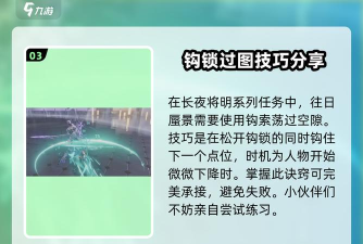 长夜将明系列任务里还有一个需要注意的小玩法,虽然具体操作起来不难,但是有不少玩家会因为错过时机而失败,就是在往日蜃景中,玩家需要使用钩索去钩正上方的点位,然后利用惯性荡过空隙,这个比较困难的一点是在松开的同时去钩下一个点位容易算不准时机,其实很简单,只要在人物有微微下降的趋势时按出钩锁就能完美进行承接,不知道这个诀窍的小伙伴们可以亲自尝试一下。