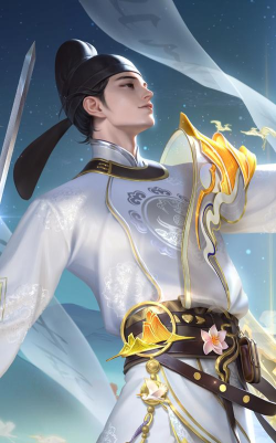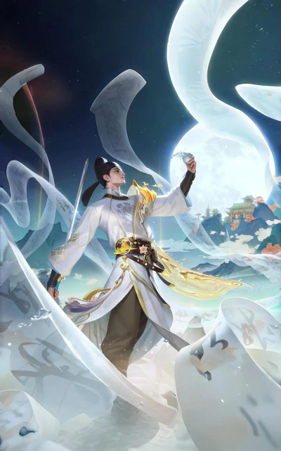 塑造了一个头扎幞头,身着圆领袍衫,脚踏长靿靴的盛唐青年诗人的形象,整体的设计将盛唐的服饰作为基础的参考,同时将明月相关的诗词通过幻想进行了演绎,谪仙醉月,啸成剑气。服饰纹样遵循了朝代服饰的特点,也比较贴合角色仙气飘飘的形象,对于传统形象的一种致敬。