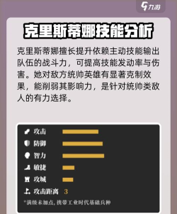 适用场景:克里斯蒂娜的技能特别适用于那些依赖主动技能进行输出的队伍,她能够显著提高这些技能的发动率和伤害,从而增强队伍的整体战斗力。在面对具有统帅英雄的敌人时,她的技能效果尤为明显,能够有效地克制敌方统帅英雄的影响力。