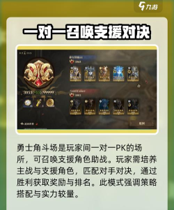而勇士角斗场则是玩家一对一的PK,但不是角色的一对一,可以召唤支援角色的,玩家可以培养自己的最强角色以及支援角色去应战,去匹配其他玩家来对决,从而获得奖励排名。