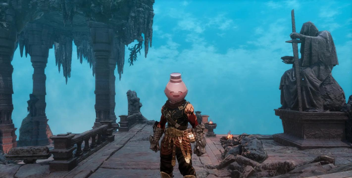 出去后绕过拱门,找到一个缺口,这里会放一个梯子,爬下来之后就一直往前走,这里只有一条路,还是很好找的。爬过多层阶梯之后,最上方是有个二层平台一样的地方,在右边拐角有个齿轮一样的石头建筑,雕像下面的小罐子是真的。