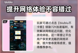 如果玩家都是想要去解锁更多加速福利,这样一来也就不用担心自己会有网络方面延迟等问题的发生,而现在所有平台用户只要去点击【biubiu不卡顿】,然后就能顺利的兑换领取到72h加速机会,再助力优化体验方面还是很不错的哦。