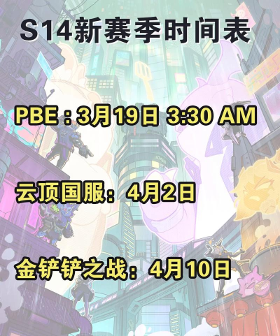 一、《云顶之弈》S14赛季正式服全球上线时间已经确定为2025年4月2日(美服、国际服同步更新),预计维护时间为1:00-12:00。手游版国服(金铲铲之战):预计4月上旬更新,稍晚于国际服。而PBE测试服已经于2025年3月19日上线了,美测服中玩家可提前体验新赛季的内容。
