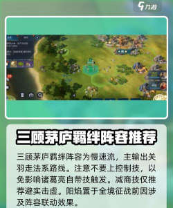 第二种就是,新出的三顾茅庐羁绊阵容,也是较为推荐的一套慢速流阵容,如果需要注意的是,主输出的关羽走的是法系路线,至于阳焰为何放在全境征战的前面,是因为涉及到阵容的联动效果。另外,这套阵容里千万不要上控制技,会影响到诸葛亮自带技的触发,并且减商技方面只推荐避实击虚。