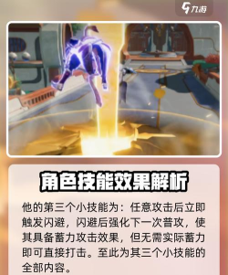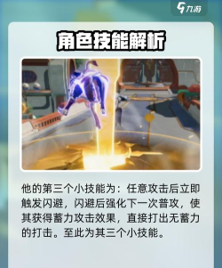 他的第三个小技能的效果进行任意攻击后马上发动一次闪避,在这次闪避后会进行一个强化,这次强化可以强化下一次的普攻,强化过后普攻可以获得蓄力攻击的效果,直接进行一次无蓄力的打击,这就是他的三个小技能了。