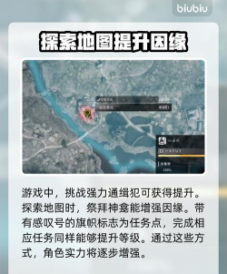 这时候会显示有哪些比较厉害的通缉犯需要惩治,打完之后也会得到提升。在探索的时候,地图上面还有一些神龛,找到之后去进行祭拜,同样可以提升因缘,要是看到一些带有感叹号的旗帜图标,过去领取任务完成,也同样能提升等级的。