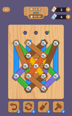 板子上钉着很多木条,螺丝钉要一个个拧下来。看着简单但挺费脑子,螺丝钉位置摆得有讲究,拧错顺序后面就卡住了。游戏里的木条会掉下来,有时候正好把空出来的螺丝孔挡住,所以得提前想好。关卡做得很不错,如果你运气好的话拧对一个能连着掉好几块木条,感觉还是挺解压的。不联网也能玩,什么时候想玩就玩。