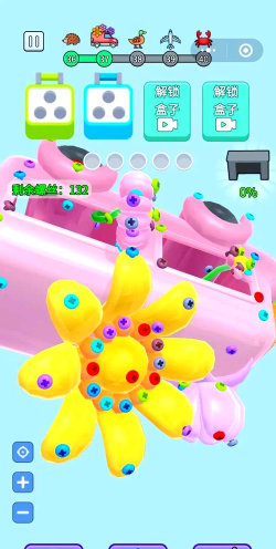 拔出来的螺丝要进行配对,三个一样颜色的就能消掉,进度条填满就算过关了。关卡挺多的,有200多个,玩法也有变化,有限时的也有带障碍的,越往后越考验脑子。道具也不少,炸弹能炸一片螺丝,彩虹螺丝能当万能的用,卡关的时候挺有用。画面是那种扁平化风格,颜色看着挺清爽,背景音乐轻快,消除的时候音效还很清爽。
