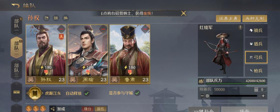 在这套阵容中,核心的武将是孙权,同样也属于续航担当。技能机制会围绕兵力恢复,还有团队增益展开,在战斗的过程中,可以给全队持续回血,稳住血线,还能驱散我方全体负面状态,避免队伍被控制。想让孙权的作用更大点,技能搭配上面有两种思路,如果追求前期的节奏,可以选择激昂类技能,或者是鼓舞类技能。想要强化续航的能力,可以选择愈合技能或者回城技能,在谋略伤害的同时,还可以触发群体回血,让队伍在长时间消耗战中,一直都可以保持保持健康的状态。