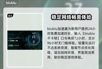 当前biubiu加速器面向全平台用户提供多项免费服务:覆盖主流游戏平台的网络加速功能完全开放;新用户注册后可立即获得24小时全功能试用权限;另附赠【biubiu不卡顿】兑换码,激活后额外获取3天加速时长,该权益新老用户均可领取。综合计算,首次使用的玩家可累计享有96小时无限制加速体验,实际效果可在真实场景中充分验证。