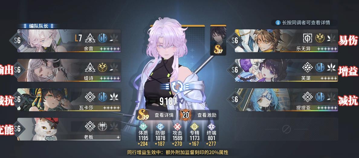 余音在空寂王庭时可作为队长,其他成员需选择瓦卡莎、老板、芙蕖、提提亚、乐无异、缇诗。其中乐无异前半场触发反应增伤,以及释放屏障规避投射物,而缇诗后半场输出。芙蕖属于万能的治疗增益,老板两个分区可开场充能加攻,提提亚则是前半场铺水减抗,瓦卡莎是后半场减抗加攻。激励推荐选择主动激励与战术强化,刻印建议激活职业联动、擒贼先擒王、奉献等,还有蓄势待发主要留给换场地后的缇诗吃,也可以更换为复数的共振或者精神振奋。