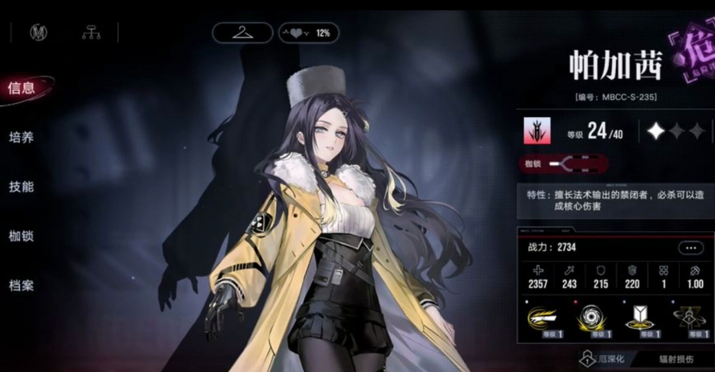 帕加茜的数值除了攻击力较低之外,其它属性都还不错,较高的防御值能让她成为法队内的抗推角色,狂厄深化能降低辐射场范围内敌人的移速,普攻是用拳头进行攻击,第一段和第二段分别造成自身攻击倍率的法伤,第三段则是快速挥舞两拳,升满后倍率加上攻速伤害还是比较高的。必杀是帕加茜释放强烈的核辐射,对九宫格范围内的敌人造成法伤,同时生成一个辐射场,还能破除范围内所有敌人一点核心,是一个群体破核技能。