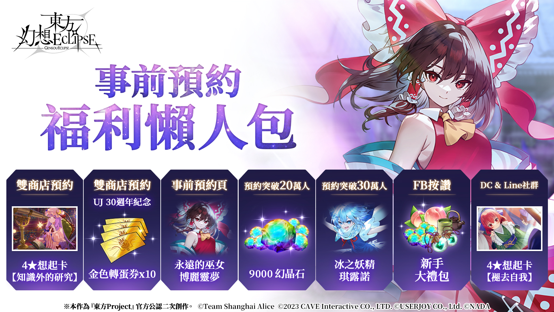 为庆祝《东方幻想ECLIPSE》繁中版即将上市,官方营运团队特别豪华预约奖励,凡完成登录报到即可获得人气角色「博丽灵梦」、金色转蛋券 x10 等丰富虚宝。