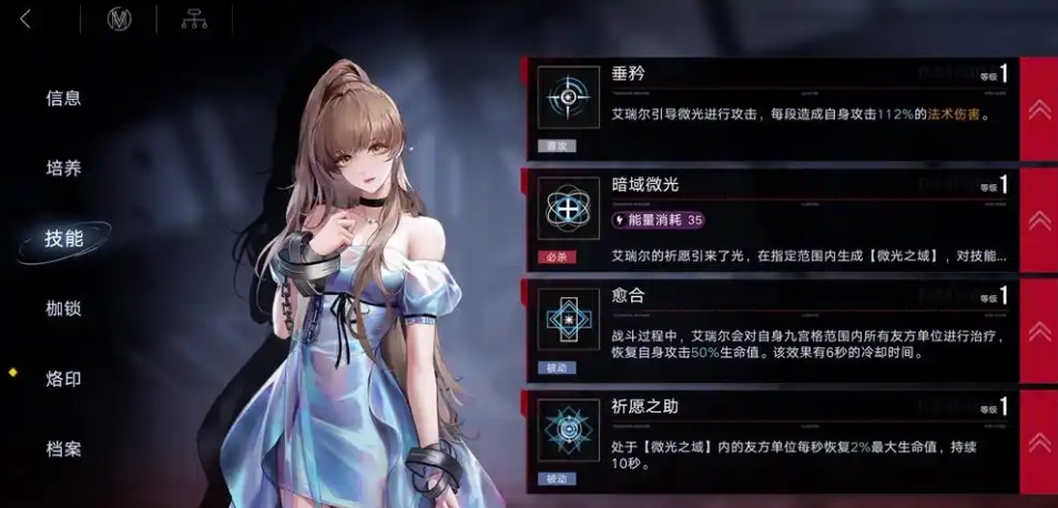 升级提升幅度不是很大,技能需要引导三秒,每零点六秒治疗一次,必杀在前期一般一级就够用,足够在三秒时间内把残血队友给抬满,必杀是她最重要的治疗技能。被动一愈合很好弥补了艾瑞尔必杀真空期较长的缺点,虽然治疗幅度不高,但在一些持续掉血的关卡有着关键作用,尽量让她站在队形中间,其他角色包围她能最大程度发挥该被动的优势。被动二祈愿之助是出于必杀范围内的队友每秒会额外回复百分之二到三最大生命值的治疗效果,召唤物也能吃到该加成。