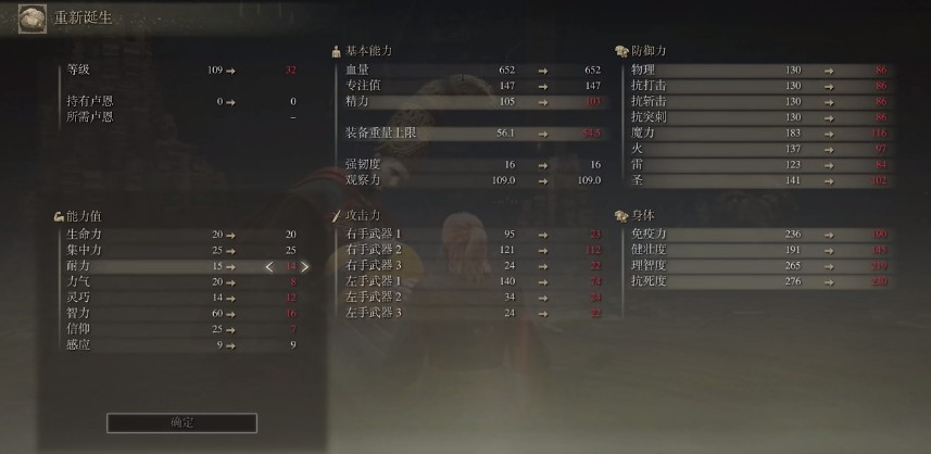 集中力对应褪色者的蓝量,前中期加点25,最后目标在38是能满足多数常用法术的连发。耐力前中期15左右,最后目标30完全够用。力气和灵巧在前期一般不用加点,中后期力气加点到20、灵巧加点14满足水母盾需求即可,在大后期水桶号的情况下,灵巧可以考虑加到70,从而得到最快的施法速度。智力加点则是法爷的重中之重,多数法杖的补正也是智力最高,前期建议加点在38左右、中期60,后期点满至80即可。
