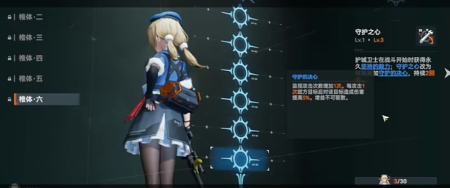六椎是大招坚持的毅力变成永久被动,大招额外添加守护的决心buff,五椎监视射击多一次,这样每回合又多一点导染,监视射击还加百分之五增伤,五椎后波波沙能达到常规限定五星的水平。波波沙的固键一是增加荣誉捍卫对大型目标伤害和此次协击的破隐,最好携带,固键二是增加护城卫士修整时期波波沙攻击,作用不是很大,固键三是增加护城卫士的攻击力,是必带的一个固键,固键四提高技能默契突围百分之十的伤害,护城卫士本身增伤很高,这百分之十的增伤基本稀释掉了,收益并不高。