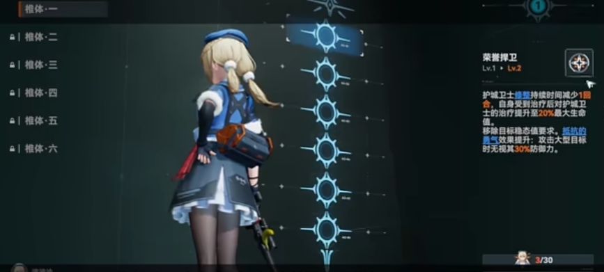 使用该技能打两次能回复两点导染,提升了循环通畅度,大招和荣誉捍卫用完就能把默契突围当输出技能用了。三椎是护城守卫增加百分之二十的暴伤和百分之三十的暴击,战斗开始时获得三层团结的力量,也就是不换目标对单有百分之三十的增伤,换目标会清零,每回合叠一层,基本算是对BOSS特化了。