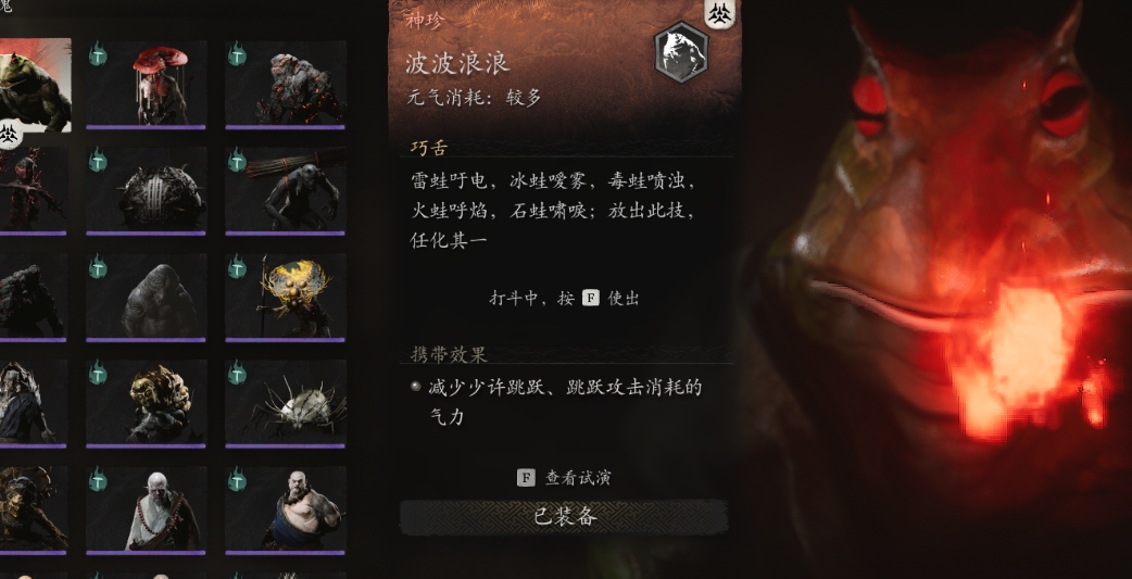 百目真人释放后能在一定范围内给自身增加攻击力,猴分身这类召唤物也能吃到增伤效果。不空释放后会向后闪退,闪退瞬间是无敌状态,这个精魄只适合高手玩家使用,新手玩家尽量还是直接用能打伤害的精魄,波波浪浪是随机化身一个属性青蛙造成大量伤害,这是唯一一个神珍精魄。隼居士是释放冰龙卷风追踪攻击前方敌人,冰冻值满了后还能将其冻住,它的CD非常段短,带上金身套基本能无限冰冻敌人。