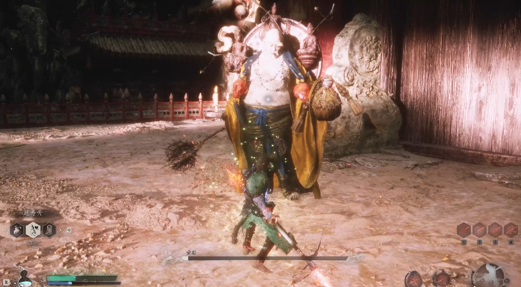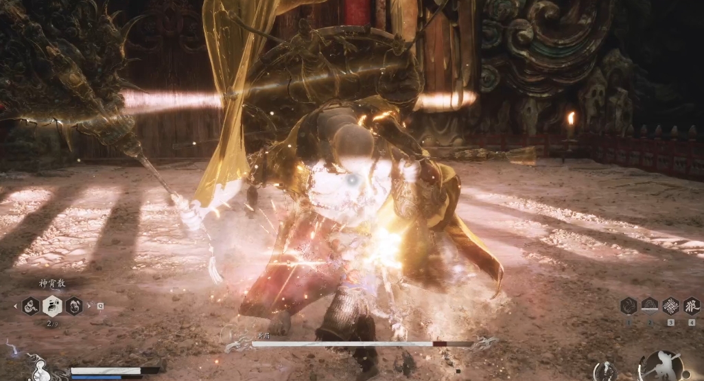 反制是进入第二阶段后黄眉会直接废除人物的定身术和毫毛,定身术会直接触发金身,猴子猴孙还会攻击自身,最好是在它硬直时使用定身术,毫毛谨慎使用。黄眉的二连踩的抬脚很明显,最好的应对方式是到它的背后进行输出,用棍势可以打断第二踩。