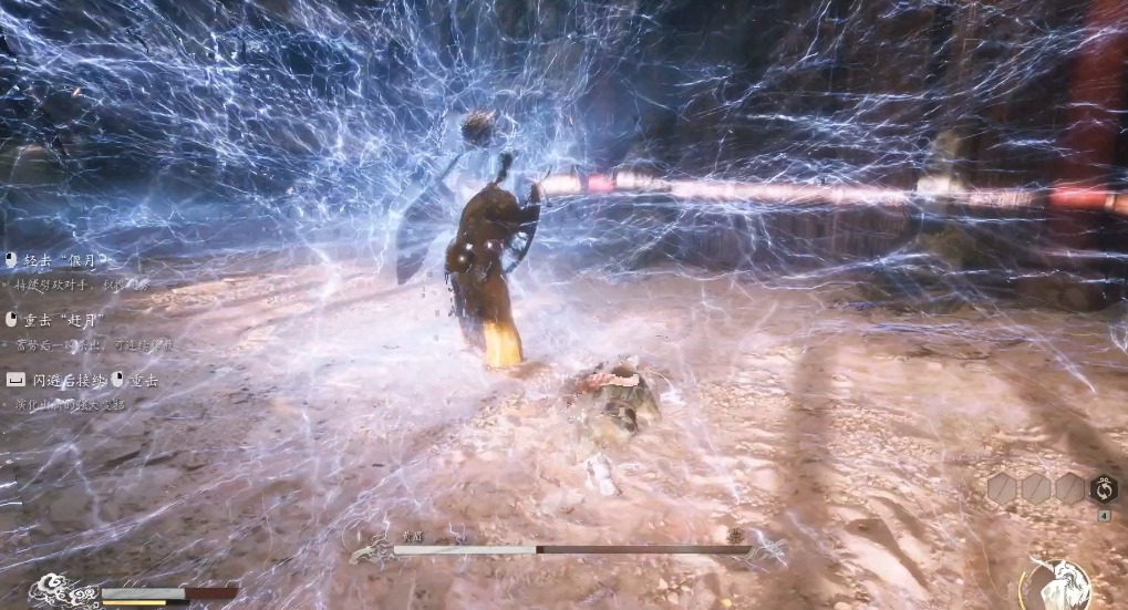 雷圈电击是举锤释放一群电粒子,并用雷圈困住玩家,触碰雷圈会造成硬直,电粒子会分两波飞向玩家,可以左右翻滚躲掉或者直接用棍花化解。雷光斩是举锤蓄力敲击地面,在玩家身下打出三道雷击,这个招式只要不是原地站躲避难度不会很大。裂地斩招式前摇很长,但出手非常快,闪躲难度较大,最好是向场地边缘撤出危险距离或者绕后攻击,这招会在地面长时间留下带电裂隙,撤离位置最好选战场边缘,让裂隙不要横跨战场压缩活动范围。