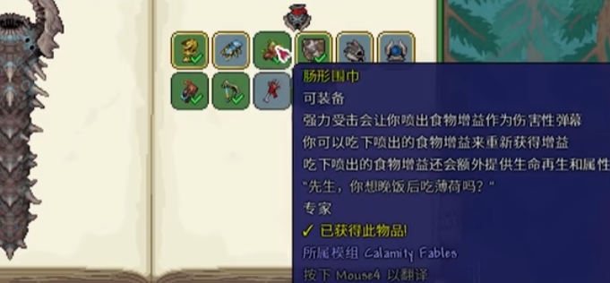 灾厄寓言模组中的饰品并不是很多,只有四个,钢钨杂技背包对比原来的版本牵引线更丝滑一些,还新增了回收钩爪的功能,虽然是占用饰品槽的钩爪,但使用得当机动性还是不错的,还自带防摔加移速,作为前期饰品来说还是比较好用。荒漠灾虫掉落的肠形围巾是专家模式饰品,它的效果是在有饱食度增益的情况下,受到敌人一定伤害时将自身buff作为一种高伤害弹幕吐出来,然后可以将吐出去的buff再吃回去来获得十秒钟的增益效果。